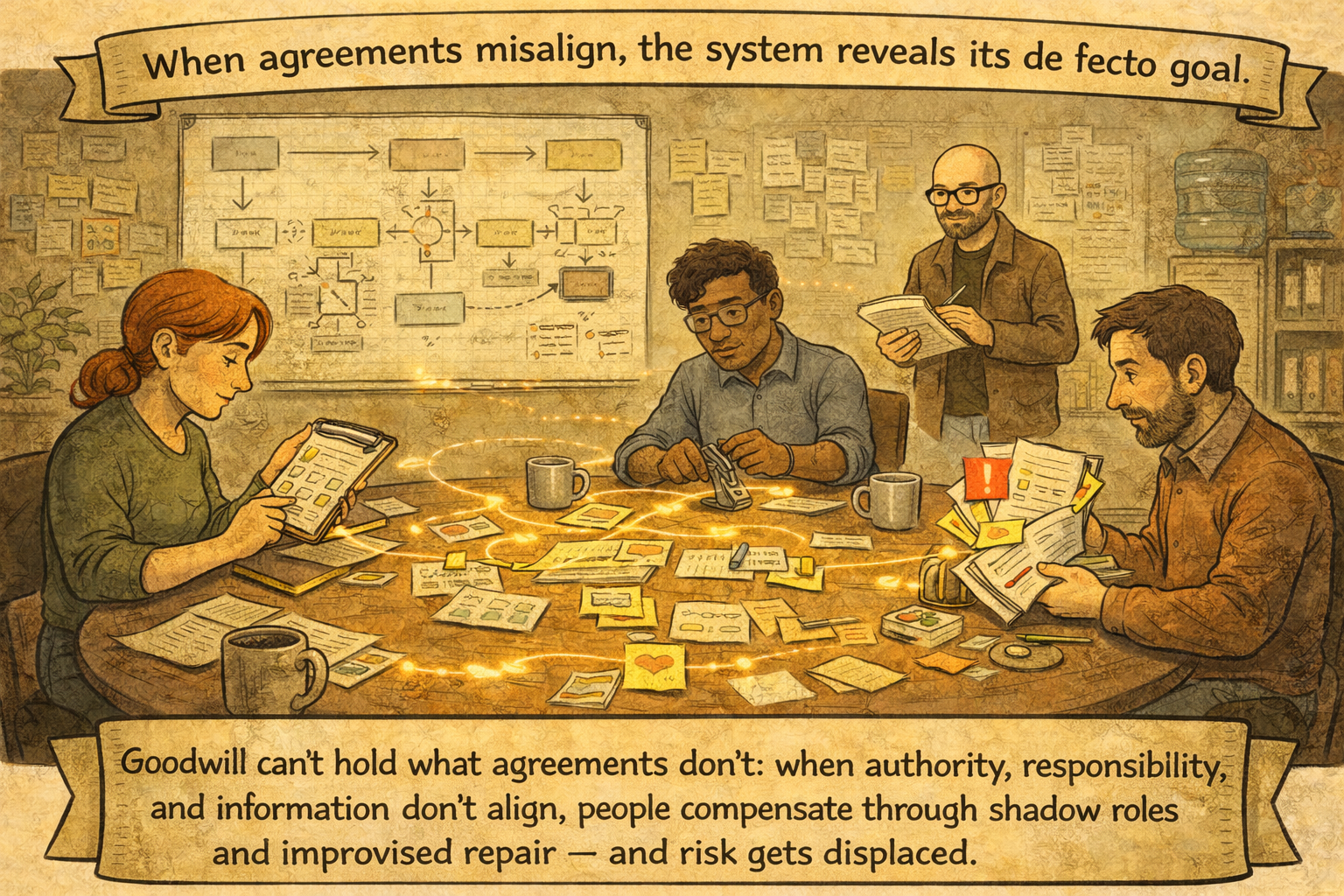 Recently, during a project engagement, one of these moments occurred again: expectations, responsibilities, and decision-making rights were visibly misaligned. On paper, the organization appeared well-structured, with clear roles, defined processes, and a formal hierarchy. In practice, however, the agreements holding the system together were contradictory. People were expected to make decisions without the authority, competencies, or information needed to do so. Leaders were accountable for processes they did not fully understand. And employees quietly compensated for structural gaps—making ad hoc judgments, repairing uncertain workflows, or correcting well-intentioned but risky decisions made upstream.