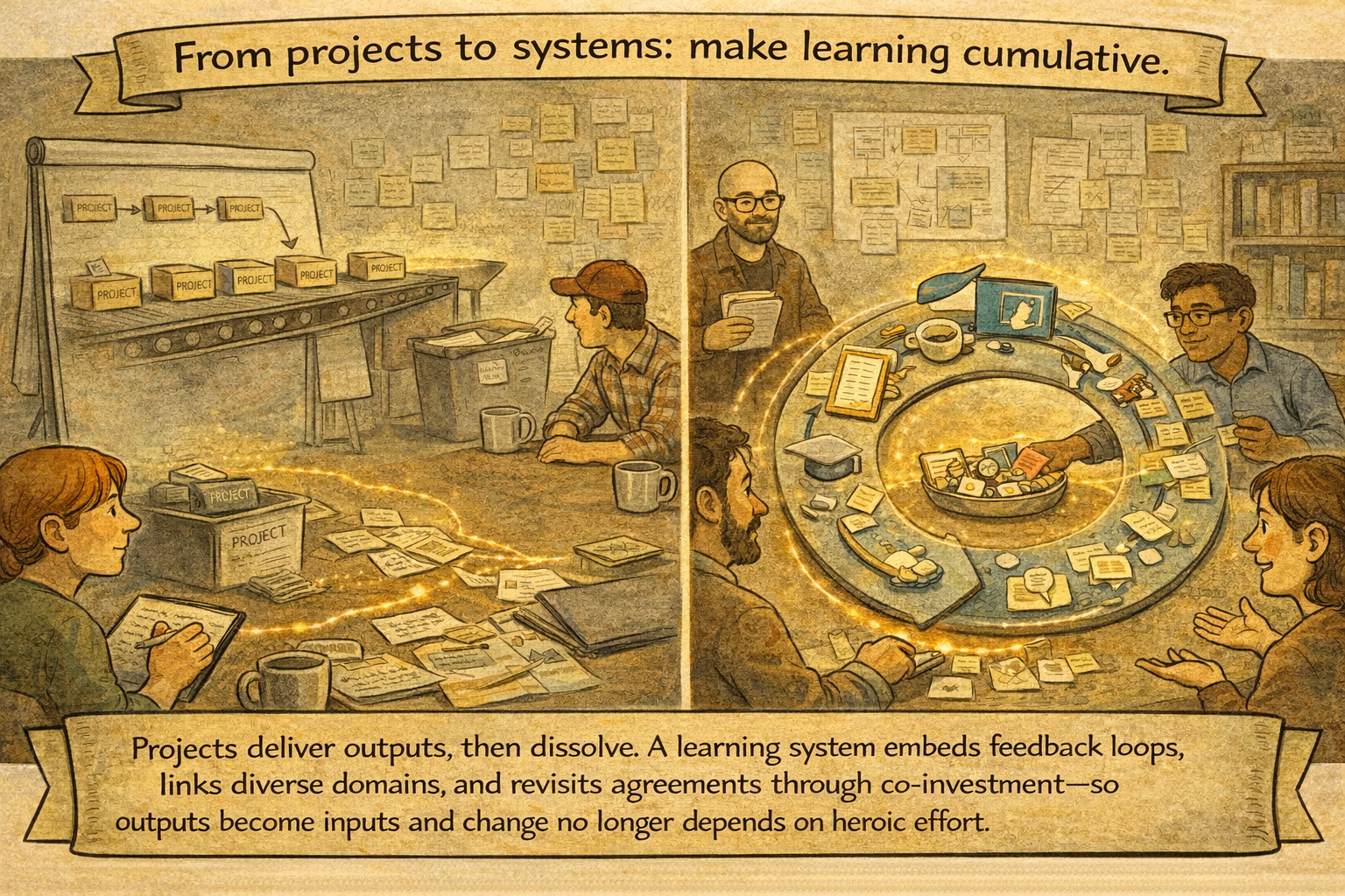 When agreements are explicit, feedback loops are active, and participation is built into the structure, learning becomes durable. Change no longer depends on extraordinary individuals or constant pressure. It becomes a property of the system itself.