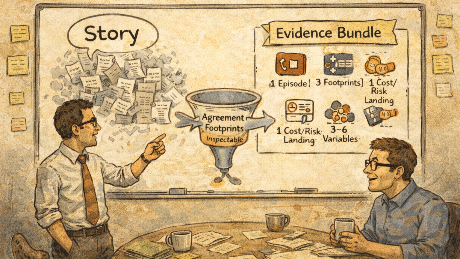 From stories to decision-grade signals: agreement footprints act as a filter that produces a minimal evidence bundle (episode, footprints, cost/risk landing, variables).