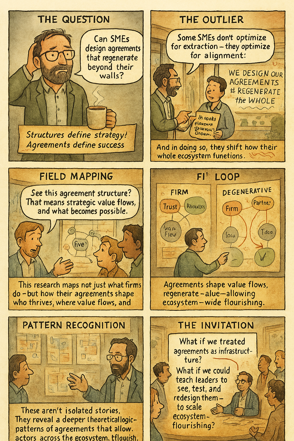 My research looks at small and medium-sized enterprise ecosystems, with a specific focus on agreements: the explicit and implicit rules that shape decision-making, accountability, and risk-sharing within and across organizational boundaries. I’m interested in the gap between formal statements and lived practice, and in how small exceptions and workarounds compound into real performance effects over time.